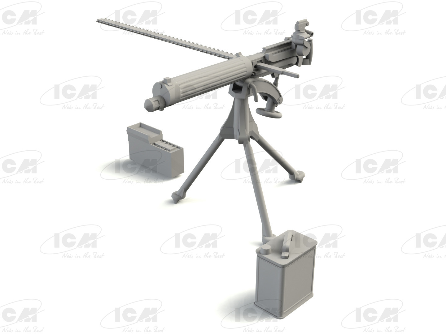 В набор входят 44 детали для сборки пулемета MG08, гильзы, пояса боеприпасов и резервуары для воды.